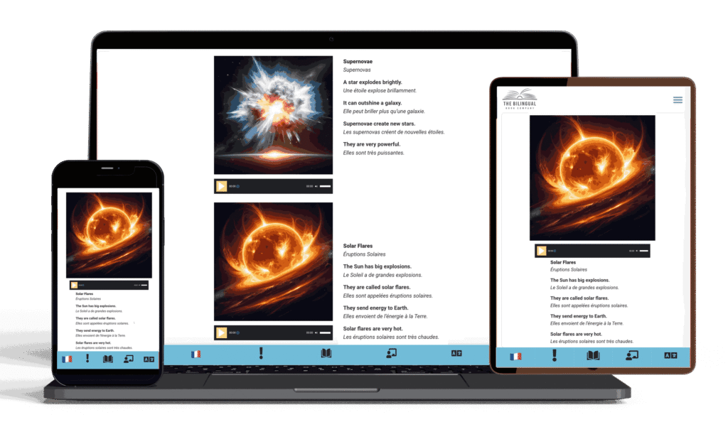 Des études montrent que l’exposition quotidienne à la langue est l’un des éléments clés qui manquent dans les programmes d’apprentissage des langues à l’école. Les élèves n’entendent tout simplement pas assez souvent la langue qu’ils apprennent.En général, cette immersion quotidienne n’a lieu que si l’on vit dans un autre pays. Nos livres audio bilingues apportent cette expérience directement à la maison, en rendant l’écoute et la lecture bilingues accessibles chaque jour. . J’ai créé ces livres audio pour résoudre ce problème, c’est aussi pourquoi je mets l’accent sur un apprentissage basé sur les centres d’intérêt. Si votre enfant apprend une langue – ou si c’est vous – la clé pour y revenir chaque jour, c’est d’y prendre plaisir. C’est là tout l’intérêt des livres audio bilingues : vous n’apprenez pas uniquement des règles de grammaire ou des listes de vocabulaire par cœur. Vous lisez et écoutez dans deux langues sur des sujets que vous aimez, tout en enrichissant votre vocabulaire. Quand l’apprentissage est naturel et intéressant, il devient une routine quotidienne… ou même un rituel du soir si vous lisez à votre enfant avant de dormir. — Angeline Pompei