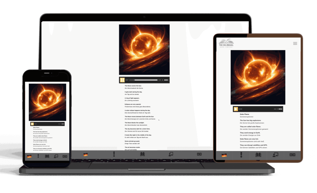 双语有声书有两种语言,包含逐行对照的译文。这样语言学习者无需额外的翻译,就能轻松跟读。每一行文字都配有双语音频,使书面语和口语能够轻松联系起来。