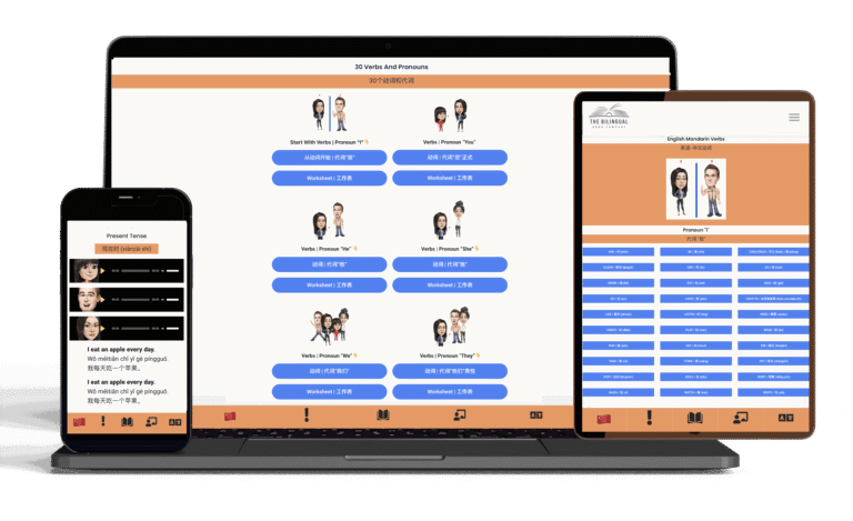 “看、听、跟读、书写”这四个步骤,让孩子能够更自然地熟悉句子结构。本部分通过重复出现的双语句子,配合音频跟读,每周学习一个动词,并结合五个简单句子练习,每次搭配一个代词。我们鼓励学生使用提供的练习纸,把句子反复写下来,有助于记住词汇和动词变化。PDF文件可以保存到电脑或手机中,并附有跳转到“30个动词与代词”页面的链接,方便随时学习。本单元由 Angeline 设计灵感来自于她对 Mensa 视觉测试的研究——这些测验非常注重“模式识别”。作为视觉型学习者,她特别设计了可反复观看的现在式、过去式和将来式句子,并提供逐句对照翻译,帮助孩子更清楚地理解动词变化。同时,为了让孩子在日常交流中更实用,她把内容精简为一种过去式和最常用的近期将来式,让学习更轻松、更有效。