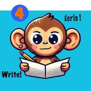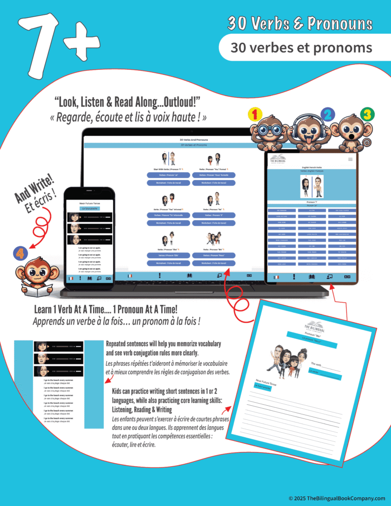 Regarder, écouter, lire en même temps et écrire : voici une approche simple et efficace pour apprendre. Les enfants observent des phrases bilingues répétées, écoutent l’audio et lisent à haute voix. Ils apprennent un verbe par semaine grâce à cinq phrases simples, avec un pronom différent à chaque fois. Nous les encourageons à utiliser la fiche d’exercices incluse, car écrire des lignes répétées aide à mémoriser le vocabulaire et les conjugaisons. Vous pouvez enregistrer le PDF sur votre ordinateur ou votre téléphone ; un lien intégré permet également d’accéder directement à la section des 30 verbes et pronoms. Cette section a été créée par Angeline, inspirée des tests de Mensa, largement fondés sur la reconnaissance de formes. En tant qu’apprenante visuelle, elle a conçu un programme où les élèves peuvent voir des phrases répétées aux temps futur, passé et présent. Les phrases répétées avec traduction permettent de mieux comprendre les règles de conjugaison. Elle a également simplifié l’apprentissage en se concentrant sur une seule forme du passé et sur le futur proche, plus adaptés aux conversations quotidiennes des enfants.