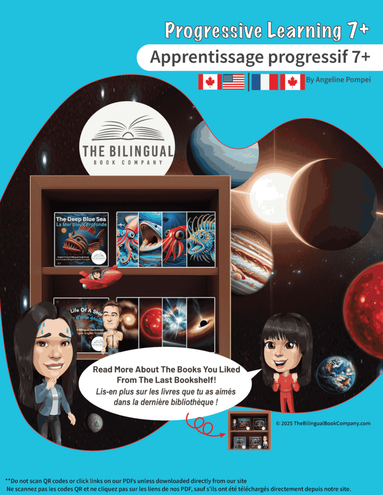 Les Lectures progressives permettent aux enfants de lire davantage sur les livres qu’ils apprécient déjà. Les titres de cette section sont les mêmes que ceux des Livres audio bilingues 7+, mais chaque page contient plus d’informations : c’est ce que nous appelons l’apprentissage par couches. Les enfants peuvent ainsi approfondir les sujets qui les intéressent tout en profitant des traductions ligne par ligne, ce qui les aide à rester motivés et à apprendre deux langues sur une plus longue durée. L’apprentissage basé sur les centres d’intérêt reste au cœur de nos supports, car il favorise vraiment la concentration et l’engagement. Vous pouvez imprimer les étagères en PDF pour que votre enfant accède facilement aux livres grâce aux QR codes, et enregistrer le PDF sur votre téléphone pour ouvrir les ressources directement via les liens du bouton bleu.