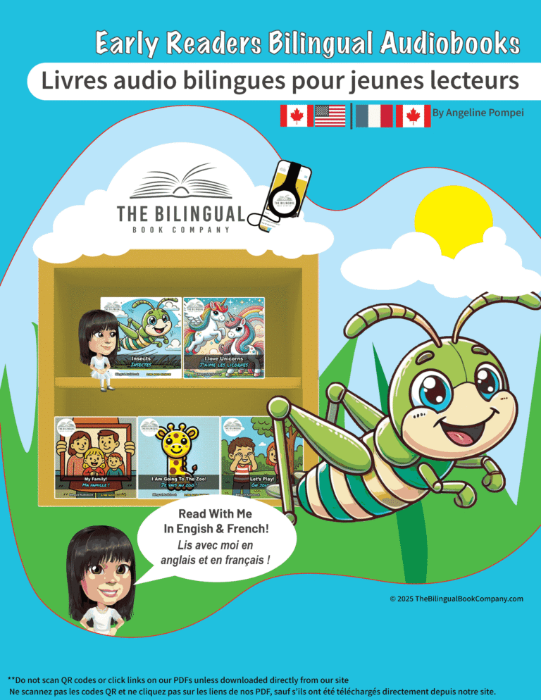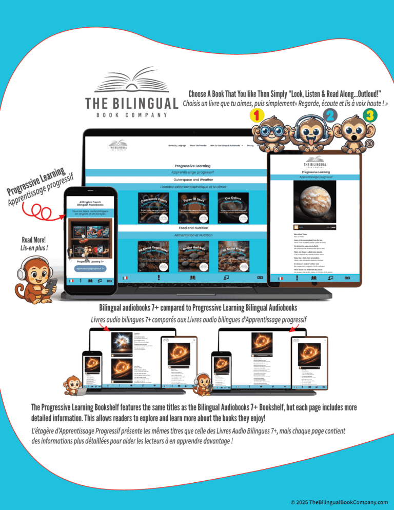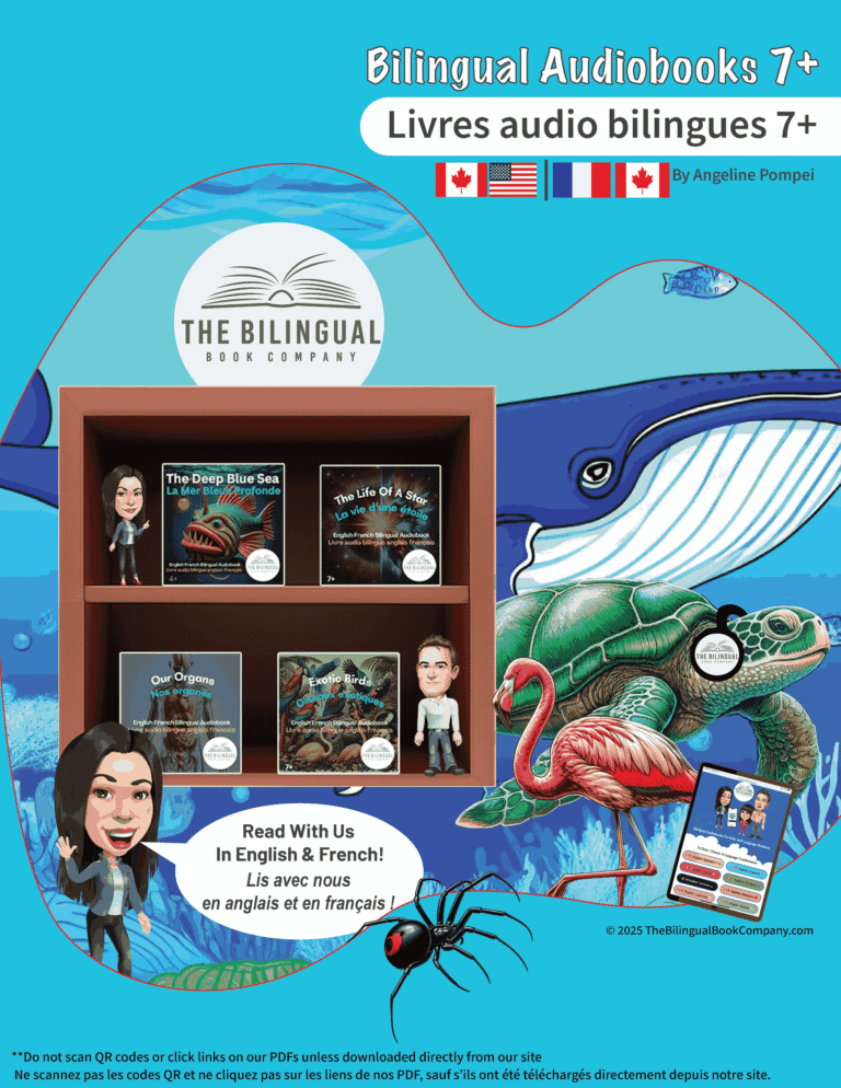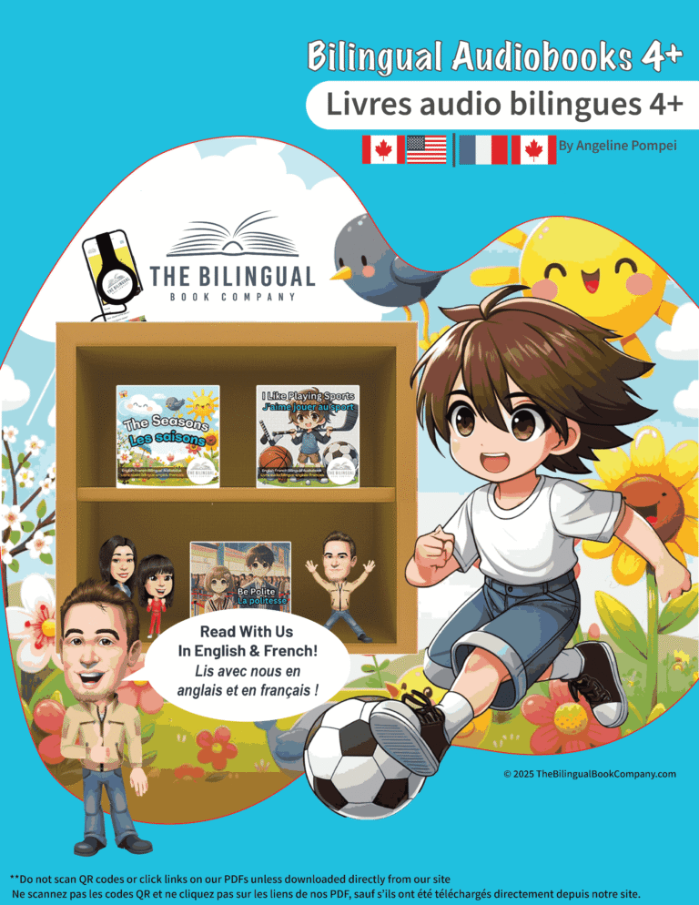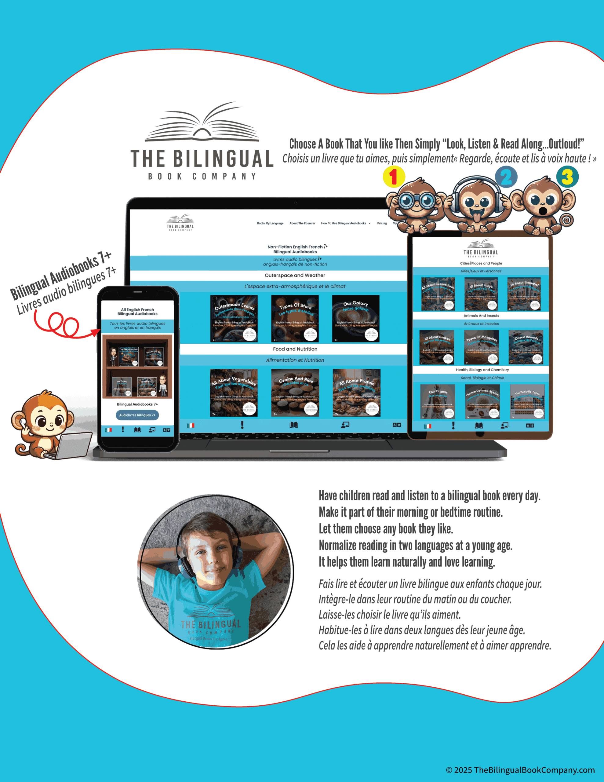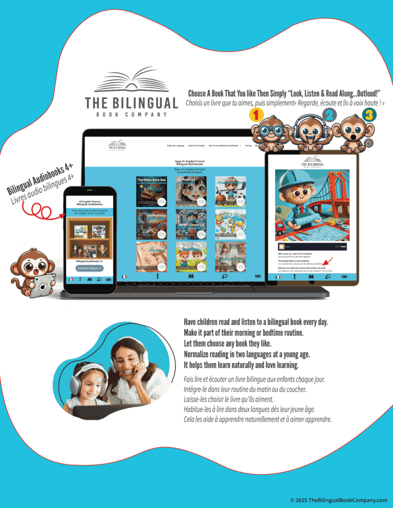 L’apprentissage d’une langue devient beaucoup plus naturel avec des livres audio bilingues : il suffit de regarder, d’écouter et de lire à voix haute. Laissez votre enfant choisir les livres qui l’inspirent ; vous pouvez lire ensemble ou écouter l’audio en même temps. Intégrer un livre bilingue dans la routine du soir est une excellente façon d’ancrer l’apprentissage dans le quotidien. De nouveaux livres audio sont ajoutés chaque mois. N’hésitez pas à imprimer les étagères PDF pour un accès facile via QR codes, et à conserver le PDF sur votre téléphone pour ouvrir les livres directement grâce aux liens.