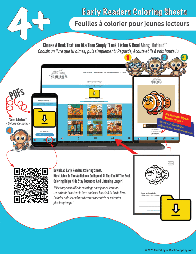 Colorier, écouter, lire et écrire : une combinaison idéale pour capter l’attention des enfants pendant qu’ils écoutent le livre audio bilingue. Dans tous nos livres audio pour jeunes lecteurs, la dernière page propose l’audio complet en boucle, permettant aux enfants de colorier tout en réécoutant le livre autant de fois qu’ils le souhaitent. Nous recommandons d’apprendre un livre par semaine : une page à colorier par jour, accompagnée de l’écoute répétée de l’audiolivre. La répétition est essentielle dans l’apprentissage des langues, et nos pages de coloriage bilingues aident également les enfants à développer des compétences fondamentales comme l’écoute, la lecture et l’écriture. Pour en savoir plus, consultez nos guides et cliquez ci-dessous pour accéder à toutes les pages de coloriage des 33 livres.