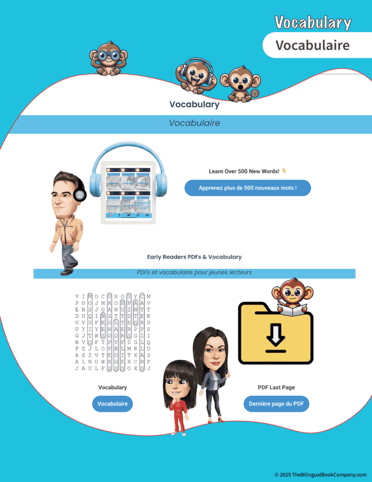Apprenez de nouveaux mots en écoutant nos audios bilingues. Sur notre site, vous trouverez trois sections dédiées au vocabulaire bilingue pour aider votre enfant à enrichir son lexique. Après l’écoute, amusez-vous aussi à chercher les mots dans nos mots mêlés, une façon simple et agréable d’apprendre à son propre rythme. Commencez dès aujourd’hui !