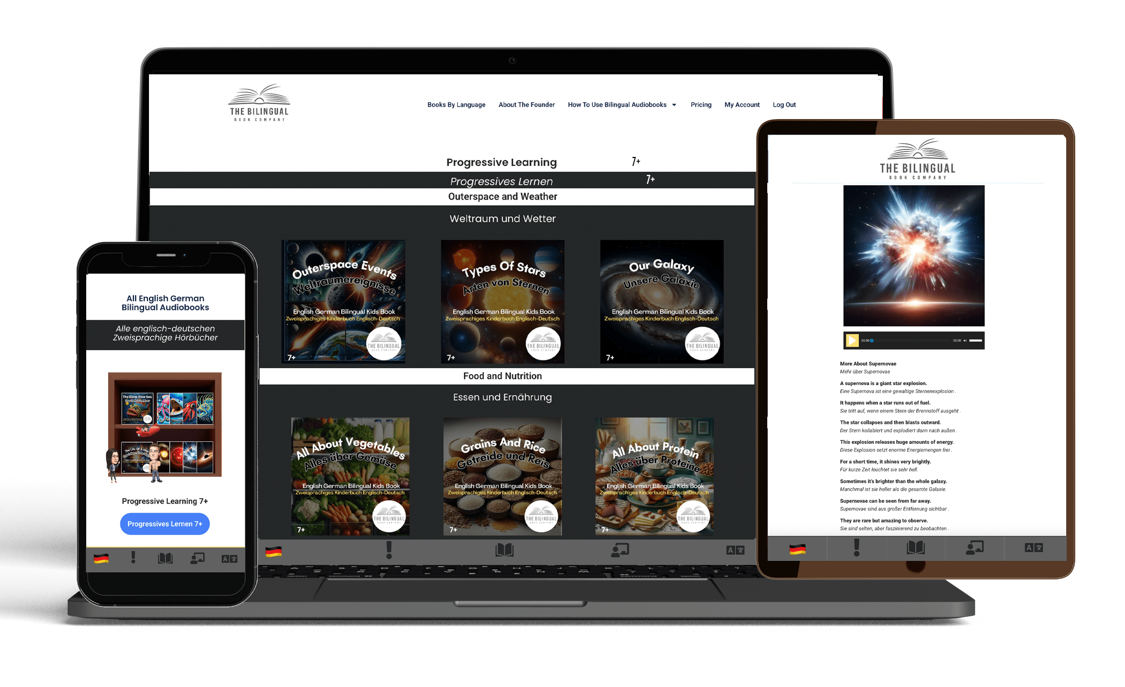 Das zweisprachige Bücherregal für fortschreitendes Lesen hat die gleichen Themen, aber jede Seite enthält MEHR Informationen