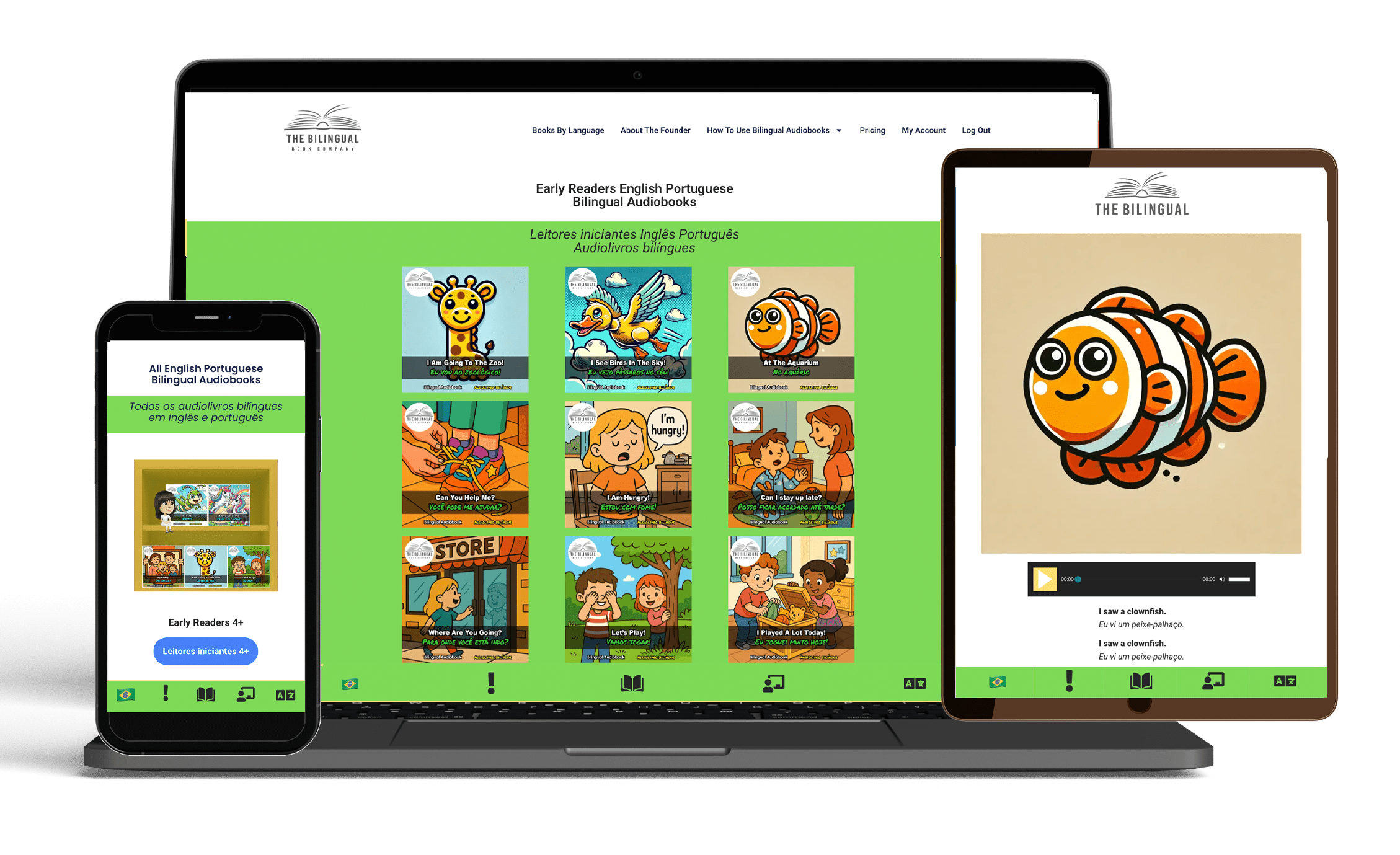 Seu filho está começando a aprender a ler? Então este é um ótimo momento para introduzir a leitura em duas línguas. Com os audiolivros bilíngues, isso se torna simples e natural. Os audiolivros bilíngues para primeiros leitores foram criados especialmente para ajudar as crianças a dar seus primeiros passos lendo em dois idiomas. A coleção inclui 33 audiolivros, cada um baseado em um verbo e construído com frases curtas e repetidas, o que facilita a aprendizagem de novo vocabulário e a compreensão da estrutura das frases. Ver as mesmas frases duas vezes ajuda a criança a perceber padrões e memorizar expressões do dia a dia. Você pode imprimir a estante em PDF para que seu filho encontre facilmente cada audiolivro por meio de códigos QR. O PDF também inclui links diretos para todos os livros. Além disso, o último código QR dá acesso a todas as páginas para colorir gratuitas relacionadas aos 33 audiolivros bilíngues.