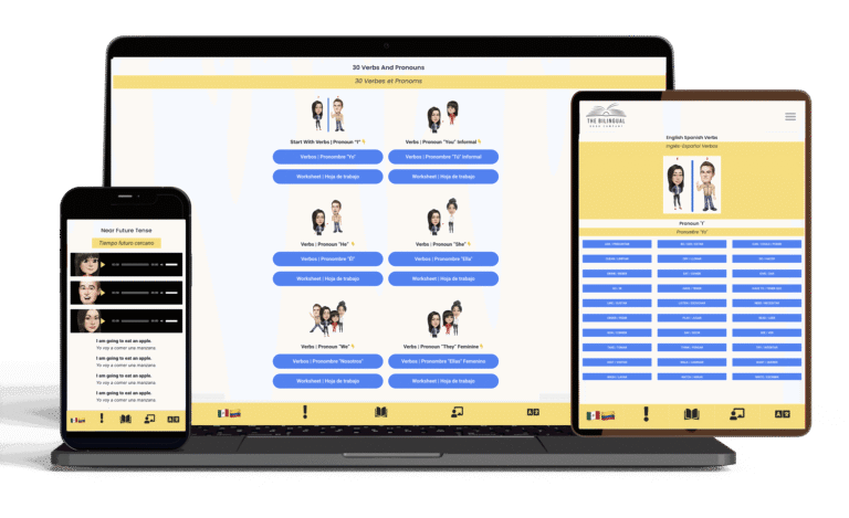 ¡Mira, escucha, lee en voz alta y escribe! Observa las oraciones bilingües repetidas, escucha el audio y lee al mismo tiempo. Aprende un verbo por semana con cinco oraciones simples, usando un pronombre cada vez. Animamos a los estudiantes a usar la hoja de práctica incluida; escribir líneas repetidas les ayuda a recordar vocabulario y la conjugación de verbos. Guarda el PDF en tu computadora o teléfono; también contiene un enlace directo a la sección de los 30 verbos y pronombres para acceder fácilmente. Esta sección fue creada por Angeline, inspirada en las pruebas de inteligencia de Mensa, que se basan en gran parte en el reconocimiento de patrones. Como aprendiz visual, diseñó este programa para que los estudiantes puedan ver oraciones repetidas en futuro, pasado y presente, con traducción línea por línea, lo que hace más fácil reconocer las reglas de conjugación. Además, simplificó la sección para que los estudiantes aprendan solo una forma del pasado y el futuro cercano, lo cual es más práctico para conversaciones cotidianas.