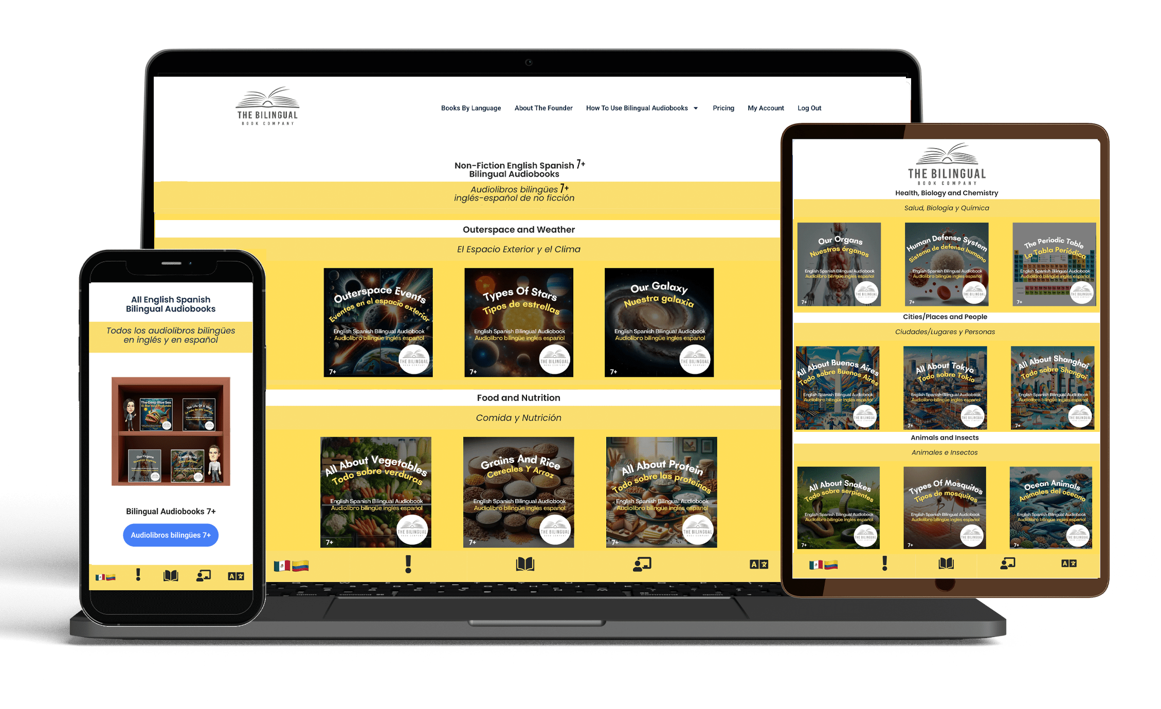 ¡Mira, escucha y lee en voz alta! Los niños y estudiantes de idiomas pueden escuchar y leer cada día los audiolibros bilingües que más les gusten. Cuando un estudiante está interesado en un tema, pasa más tiempo leyendo y aprendiendo en dos idiomas—esto es lo que llamamos aprendizaje basado en intereses. Muchos estudios muestran que quienes no logran aprender un segundo idioma suelen carecer de exposición diaria al idioma, por eso es tan importante escuchar y leer un poco todos los días. Nuestro programa se basa en esta idea: para que el aprendizaje forme parte de la rutina diaria, debe haber disfrute, y por eso creamos libros con muchos temas diferentes. Recomendamos leer un libro al día para lograr esa exposición constante. Las traducciones línea por línea permiten que los estudiantes aprendan de manera independiente. Puedes imprimir las estanterías en PDF para acceder a los libros fácilmente mediante códigos QR y guardar el PDF en tu teléfono para abrir los audiolibros bilingües desde los enlaces.