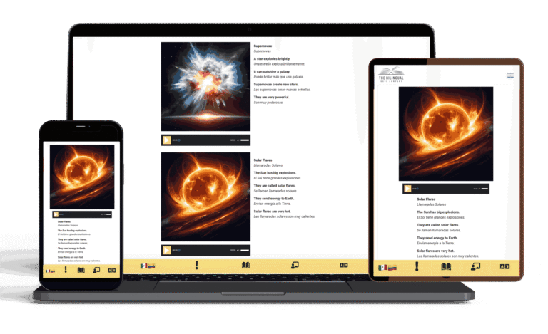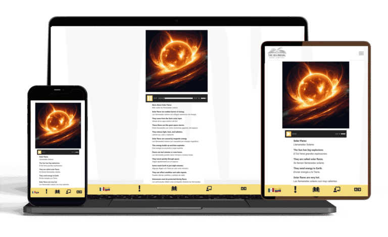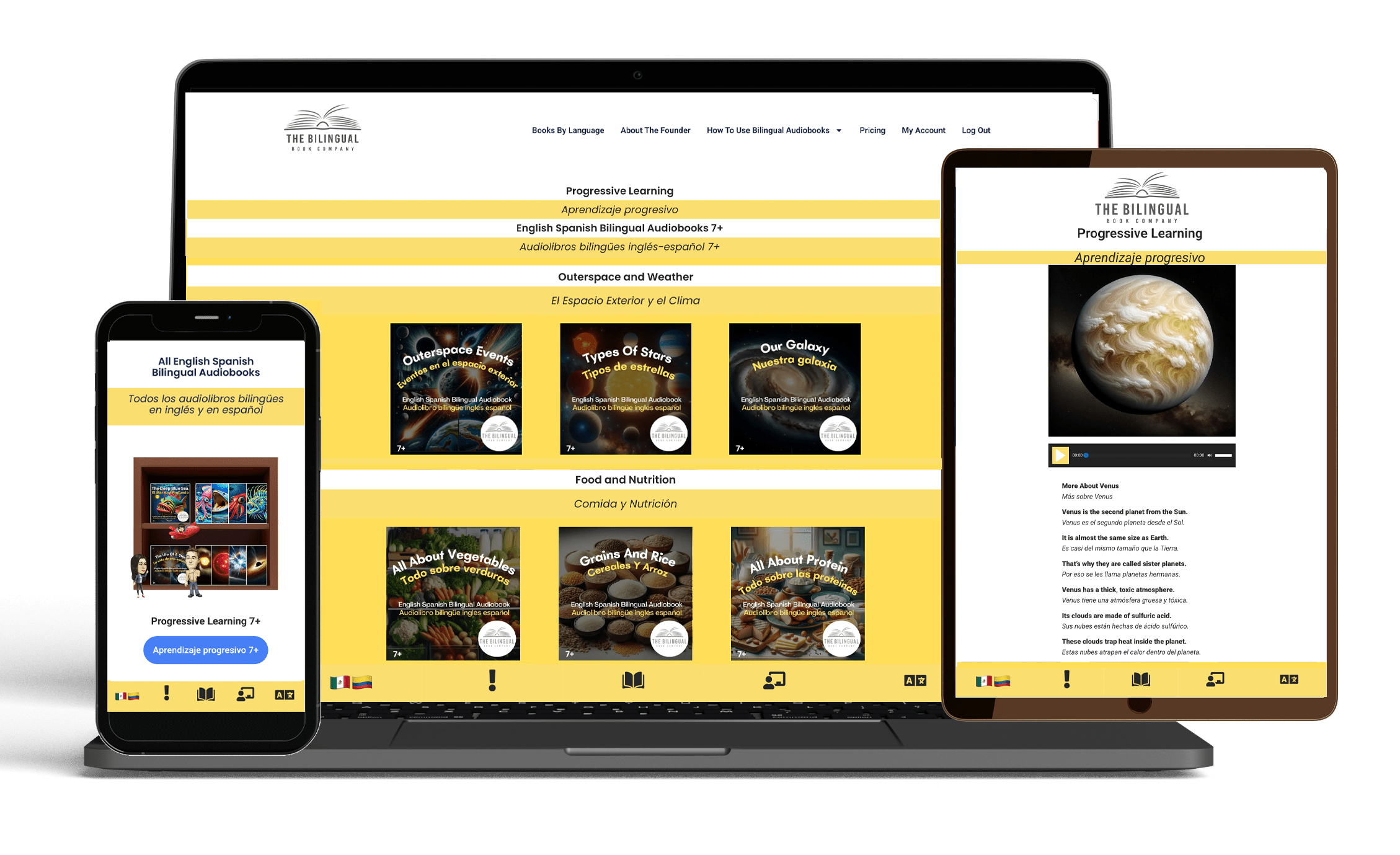 Los Progressive Readers permiten leer más sobre los libros que ya les gustan. Estos audiolibros tienen los mismos títulos que la sección anterior, Bilingual Audiobooks 7+, pero incluyen más información en cada página, lo que llamamos aprendizaje por capas. Así, los niños pueden seguir leyendo sobre los temas que les interesan con traducciones línea por línea, manteniéndose motivados y aprendiendo dos idiomas durante más tiempo. El aprendizaje basado en intereses es una idea central de nuestro programa porque ayuda a que los estudiantes se mantengan comprometidos. Puedes imprimir las estanterías en PDF para que tu hijo acceda a los libros fácilmente mediante códigos QR y guardar el PDF en tu teléfono para abrirlos desde los enlaces del botón azul.