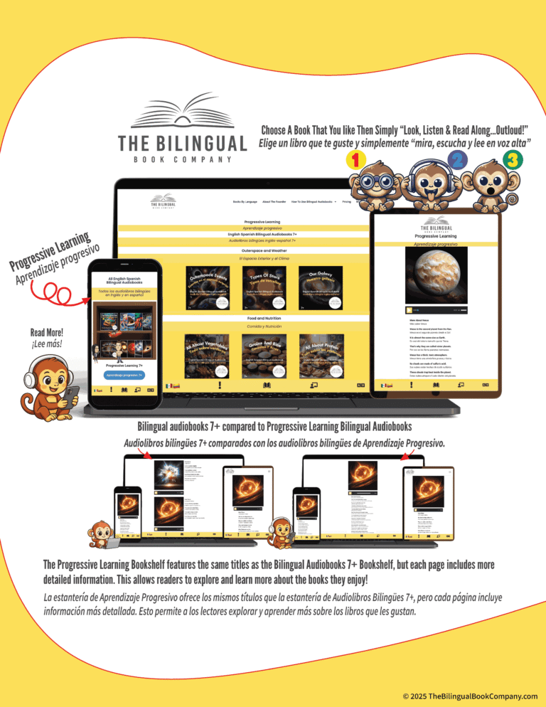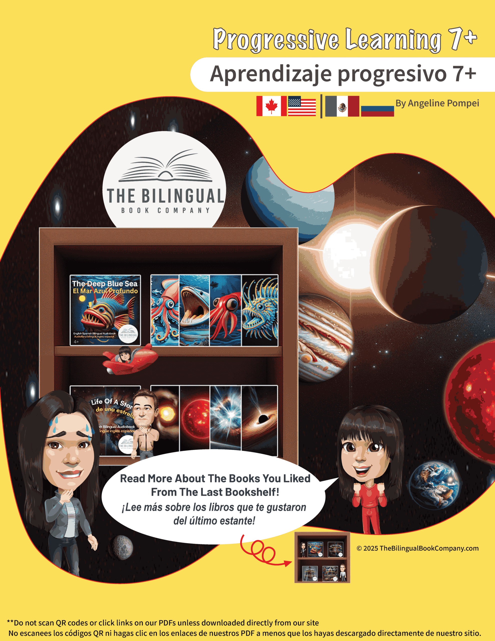 Los Progressive Readers permiten leer más sobre los libros que ya les gustan. Estos audiolibros tienen los mismos títulos que la sección anterior, Bilingual Audiobooks 7+, pero incluyen más información en cada página, lo que llamamos aprendizaje por capas. Así, los niños pueden seguir leyendo sobre los temas que les interesan con traducciones línea por línea, manteniéndose motivados y aprendiendo dos idiomas durante más tiempo. El aprendizaje basado en intereses es una idea central de nuestro programa porque ayuda a que los estudiantes se mantengan comprometidos. Puedes imprimir las estanterías en PDF para que tu hijo acceda a los libros fácilmente mediante códigos QR y guardar el PDF en tu teléfono para abrirlos desde los enlaces del botón azul.