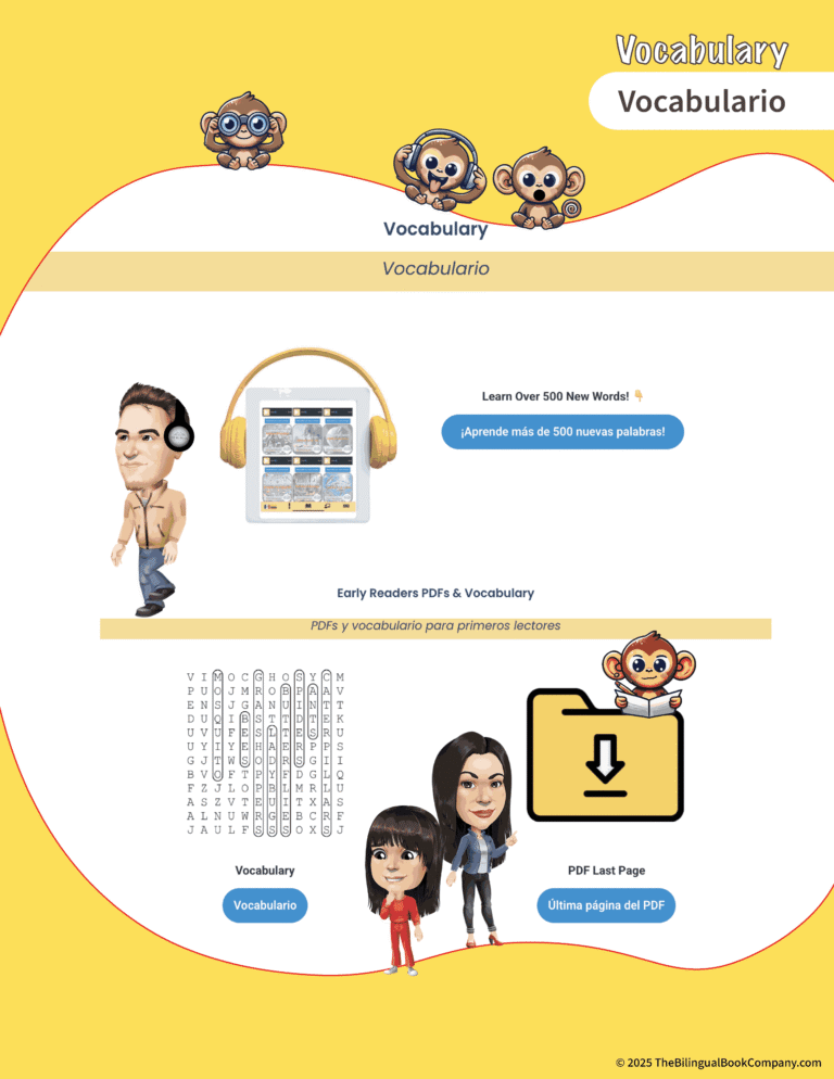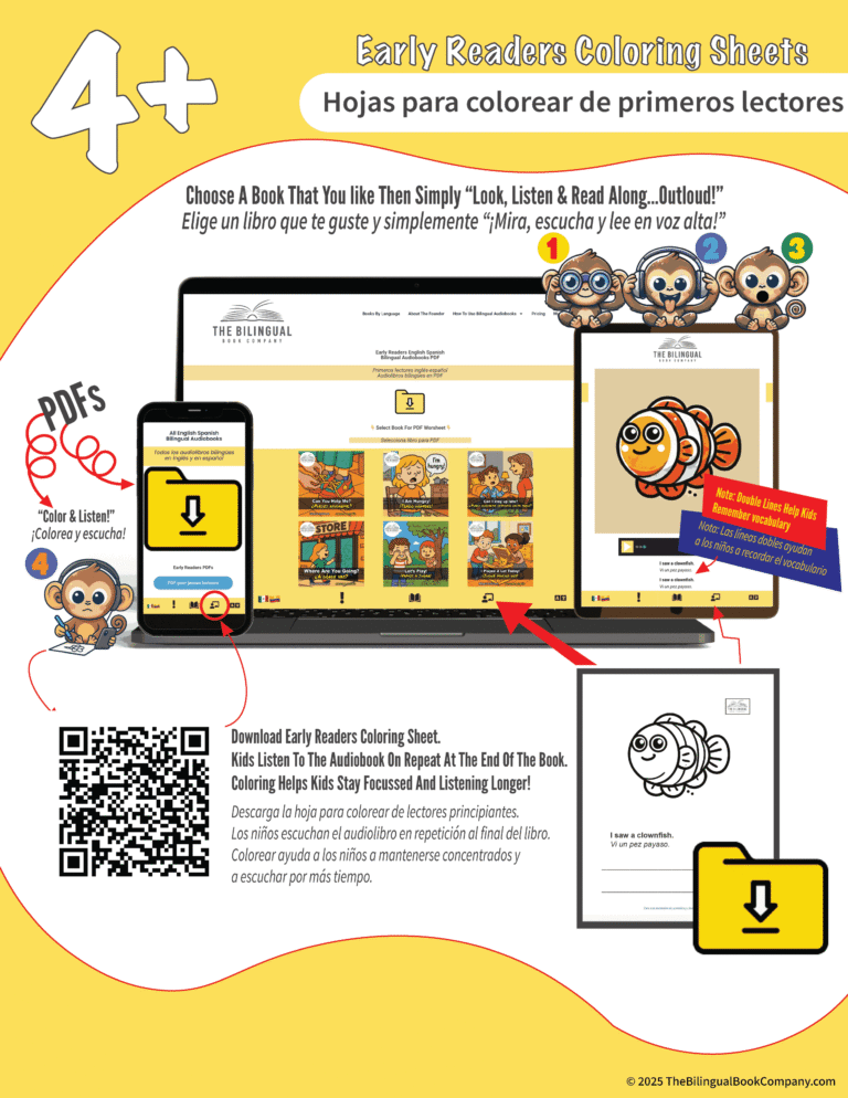¡Color, escucha, lee y escribe! Colorear ayuda a mantener la atención de los niños mientras escuchan el audiolibro bilingüe. La última página de todos los early readers incluye el audio completo en repetición para que los niños puedan colorear, escuchar, leer y escribir al mismo tiempo. Recomendamos aprender un libro por semana: colorear una página al día mientras escuchan el audiolibro bilingüe en repetición. La repetición es clave en el aprendizaje de idiomas, y nuestras páginas para colorear también refuerzan habilidades fundamentales como escuchar, leer y escribir. Para más detalles, consulta nuestras guías y haz clic abajo para acceder a todas las páginas para colorear de los 33 libros.