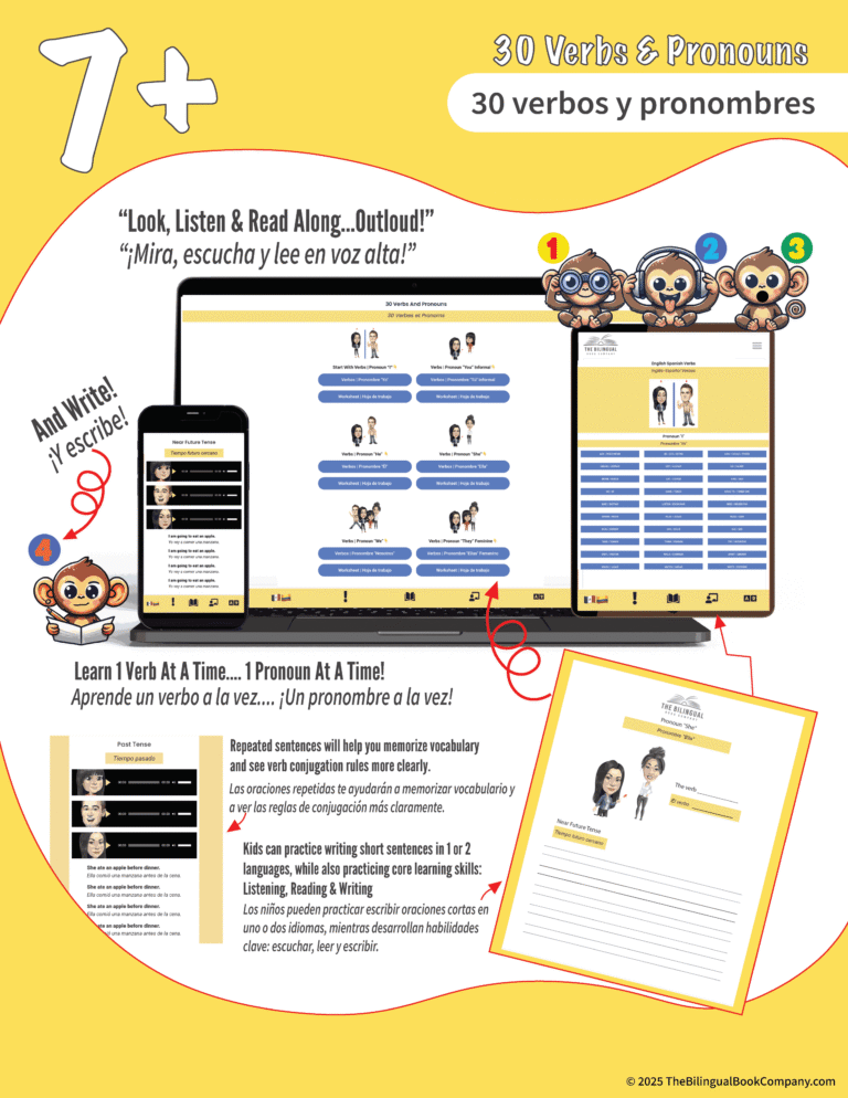 ¡Mira, escucha, lee en voz alta y escribe! Observa las oraciones bilingües repetidas, escucha el audio y lee al mismo tiempo. Aprende un verbo por semana con cinco oraciones simples, usando un pronombre cada vez. Animamos a los estudiantes a usar la hoja de práctica incluida; escribir líneas repetidas les ayuda a recordar vocabulario y la conjugación de verbos. Guarda el PDF en tu computadora o teléfono; también contiene un enlace directo a la sección de los 30 verbos y pronombres para acceder fácilmente. Esta sección fue creada por Angeline, inspirada en las pruebas de inteligencia de Mensa, que se basan en gran parte en el reconocimiento de patrones. Como aprendiz visual, diseñó este programa para que los estudiantes puedan ver oraciones repetidas en futuro, pasado y presente, con traducción línea por línea, lo que hace más fácil reconocer las reglas de conjugación. Además, simplificó la sección para que los estudiantes aprendan solo una forma del pasado y el futuro cercano, lo cual es más práctico para conversaciones cotidianas.