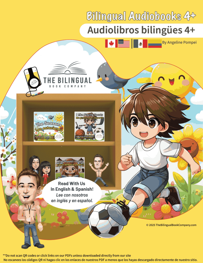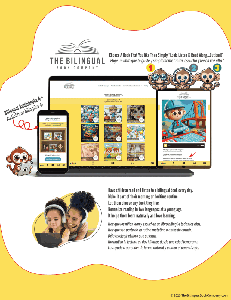 Aprender idiomas de manera natural es más sencillo con audiolibros bilingües: solo tienen que mirar, escuchar y leer en voz alta. Deja que tu hijo elija los libros que más le llamen la atención; pueden leer juntos o escuchar el audiolibro al mismo tiempo, y convertir los libros bilingües en parte de la rutina nocturna es una excelente forma de reforzar el aprendizaje. Cada mes se agregan nuevos audiolibros, y puedes imprimir las estanterías en PDF para que tu hijo acceda a los libros con códigos QR o guardar el PDF en tu teléfono para abrirlos rápidamente desde los enlaces web.