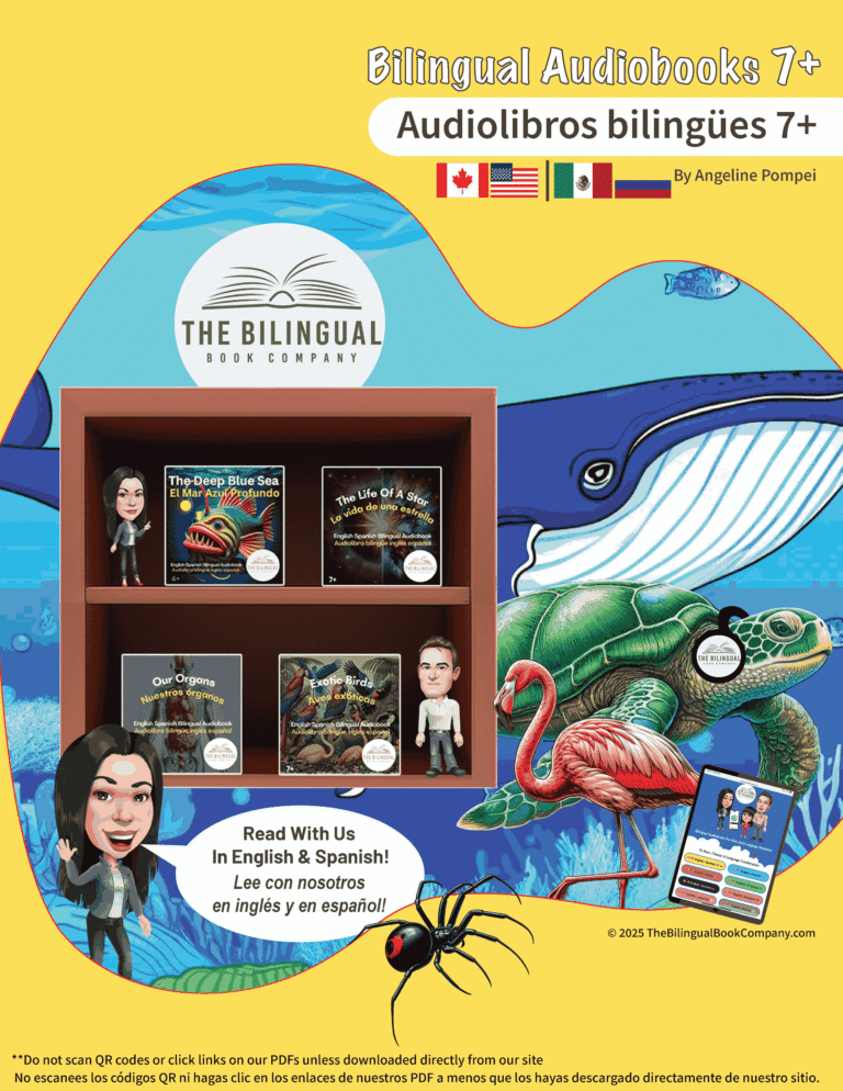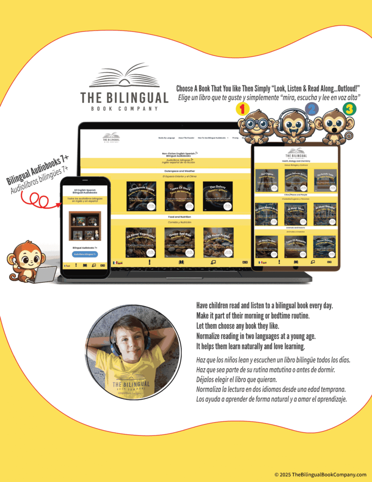 ¡Mira, escucha y lee en voz alta! Los niños y estudiantes de idiomas pueden escuchar y leer cada día los audiolibros bilingües que más les gusten. Cuando un estudiante está interesado en un tema, pasa más tiempo leyendo y aprendiendo en dos idiomas—esto es lo que llamamos aprendizaje basado en intereses. Muchos estudios muestran que quienes no logran aprender un segundo idioma suelen carecer de exposición diaria al idioma, por eso es tan importante escuchar y leer un poco todos los días. Nuestro programa se basa en esta idea: para que el aprendizaje forme parte de la rutina diaria, debe haber disfrute, y por eso creamos libros con muchos temas diferentes. Recomendamos leer un libro al día para lograr esa exposición constante. Las traducciones línea por línea permiten que los estudiantes aprendan de manera independiente. Puedes imprimir las estanterías en PDF para acceder a los libros fácilmente mediante códigos QR y guardar el PDF en tu teléfono para abrir los audiolibros bilingües desde los enlaces.