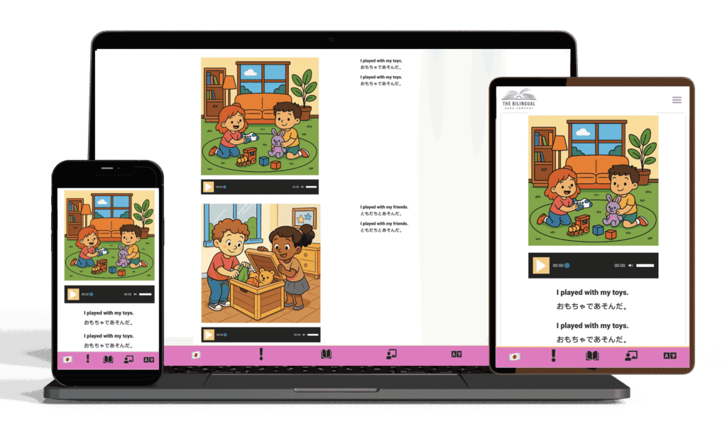 这就是我创建这个系统的原因,它能给你每天的语言接触环境。双语有声书来自 The Bilingual Book Company,专注于最重要的技能:听、读和写。