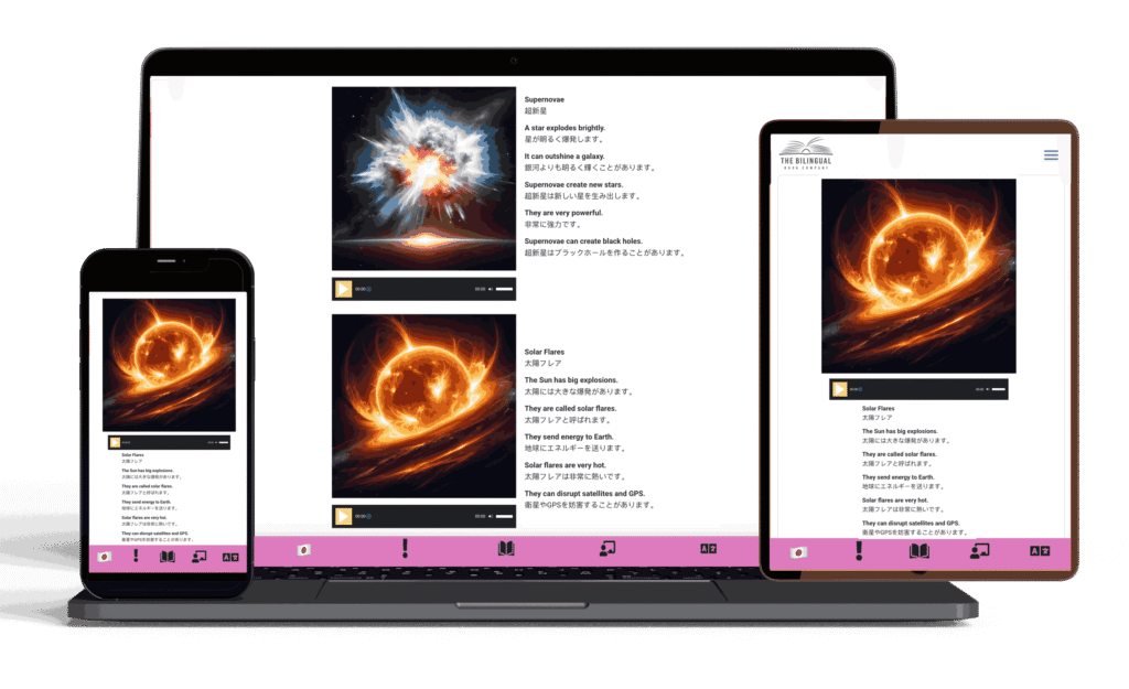 聆听并阅读更多,关于你喜欢的书!进阶阅读部分帮助学生更多地了解他们喜欢的书籍。我称之为“兴趣导向学习”。例如,如果他们喜欢《一颗恒星的一生》这本书,他们可以在本部分学到更多关于恒星的知识。选择相同的封面,读者可以进入相同的书页,但文字更多、事实更多。这让学习者保持专注,更长时间地阅读和聆听。他们继续在两种语言中建立语言技能和知识。向下滚动查看我所说的示例。先读双语有声书的简短版本。然后,在进阶阅读部分阅读更多关于同一本书的内容!